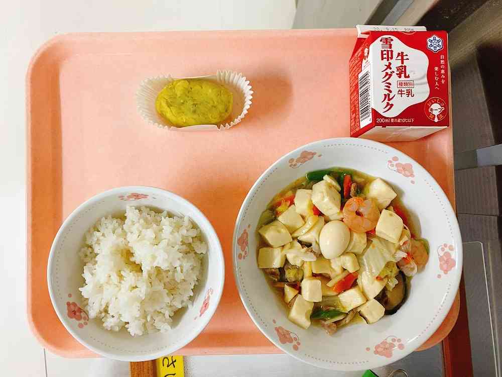 ごはん、豆腐とエビの中華炒め、スイートポテト