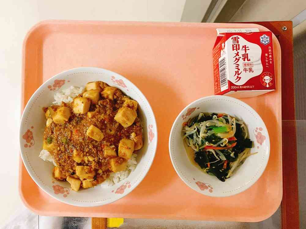 麻婆丼、もやしとわかめのごま醤油
