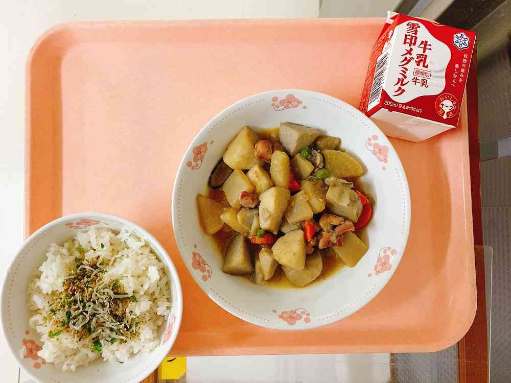 ごはん、じゃこふりかけ、鶏肉と里芋の炒め煮