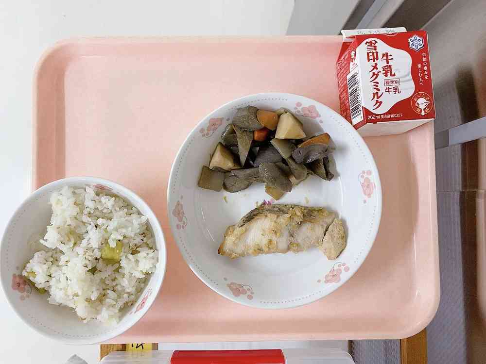 さつまいもごはん、魚の香味焼き、野菜の炒め煮