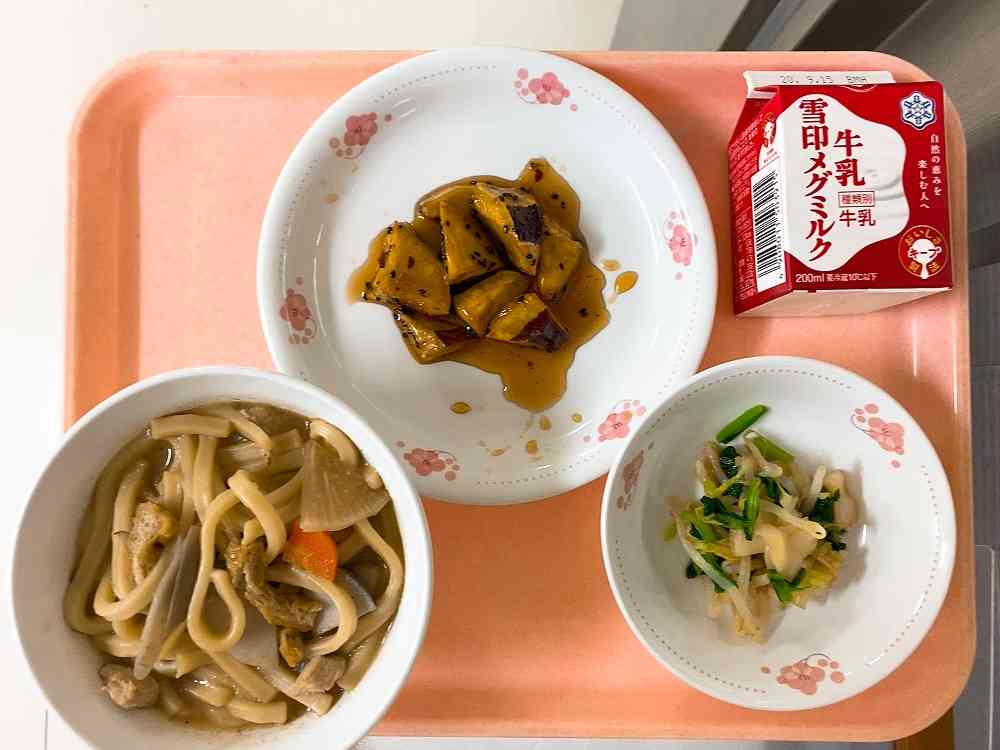 けんちんうどん、おひたし(だし醤油)、大学いも