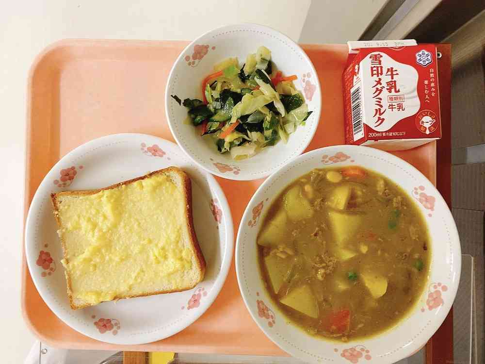 クリームチーズトースト、カレーシチュー、わかめ入りサラダ