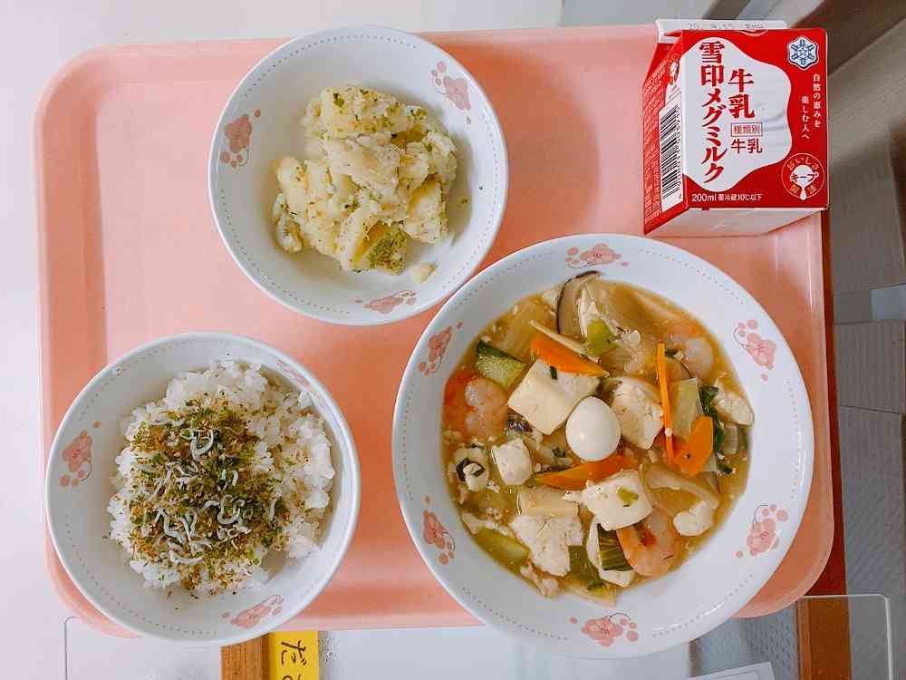 ごはん、じゃこふりかけ、豆腐とえびの旨煮、じゃがいもの香味和え