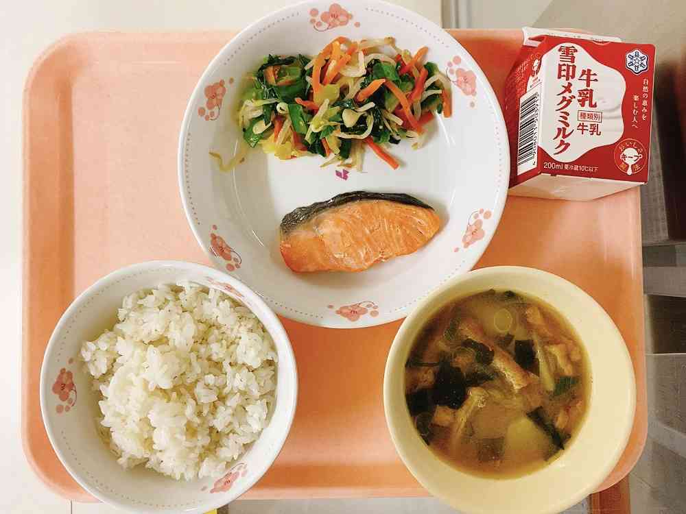 ごはん、鮭の塩焼き、小松菜の和え物、じゃがいものみそ汁