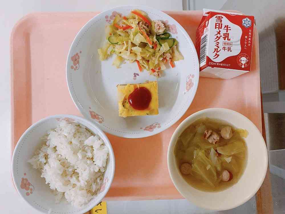 ごはん、ポテトオムレツ、ツナ入りサラダ、野菜スープ