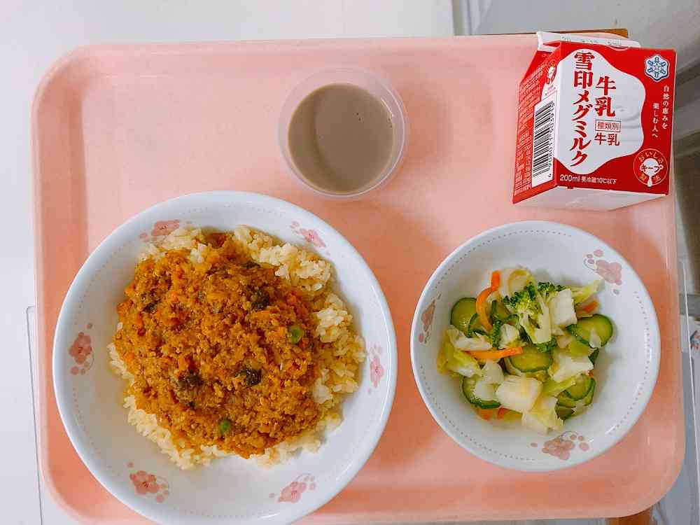 ドライカレー、ブロッコリーとじゃがいものサラダ、1-1のリクエストメニュー(チョコプリン)
