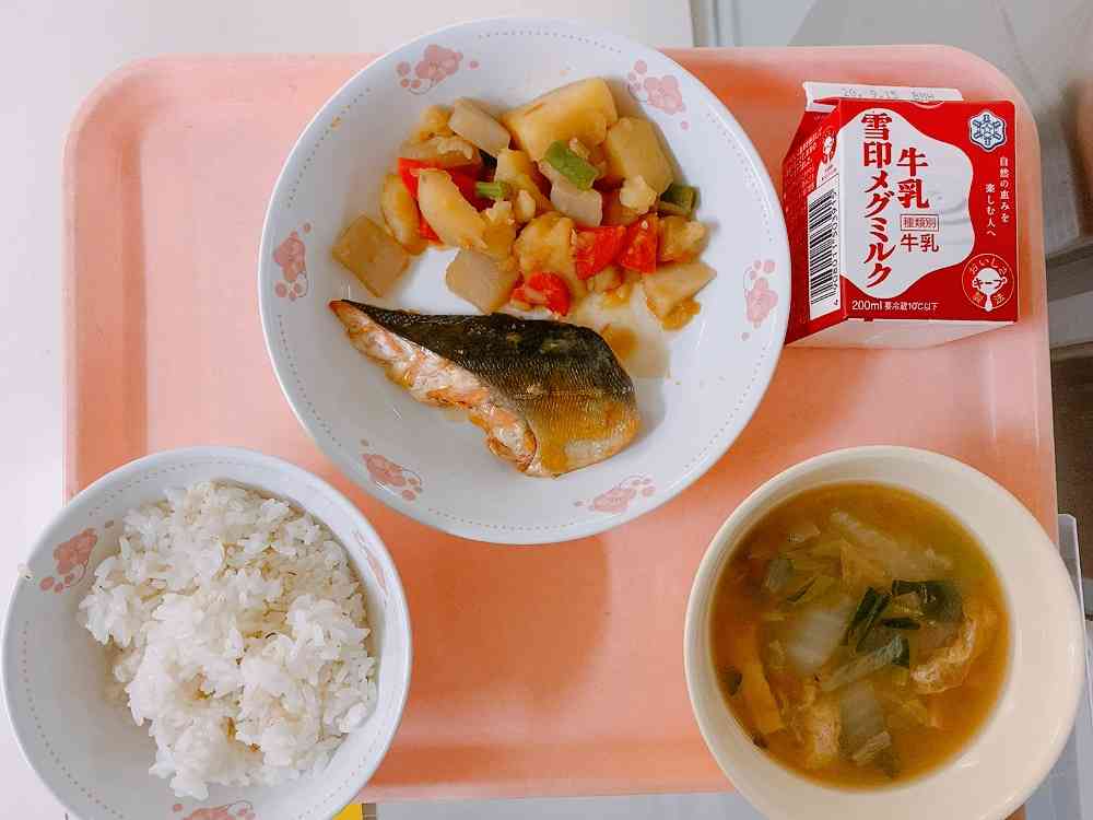 ごはん、魚の照り焼き、じゃがいもの煮物、白菜と油揚げのみそ汁