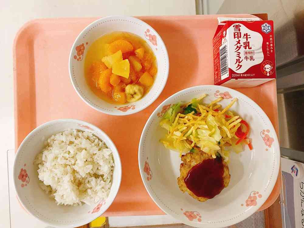 ごはん、豆腐ハンバーグ、サクサクポテトのハニーサラダ、しゅわしゅわフルーツポンチ 今日は6年生がスペシャルデーのため、6年生が考えた献立です。