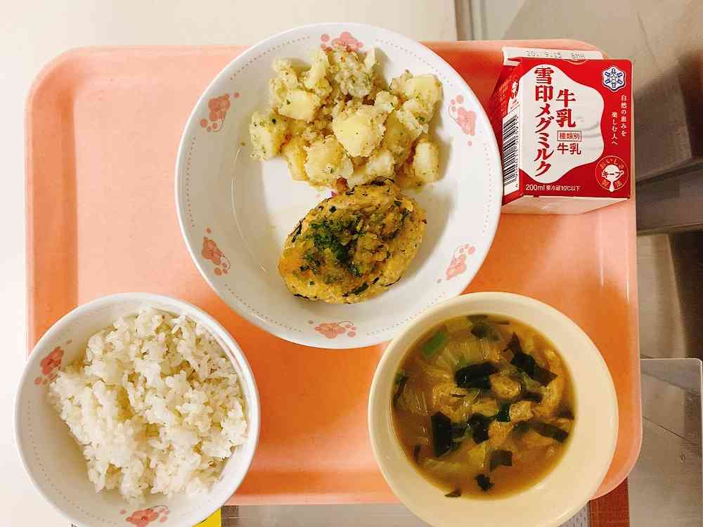 ごはん、和風豆腐ハンバーグ、じゃがいもの香味和え、白菜と油揚げのみそ汁