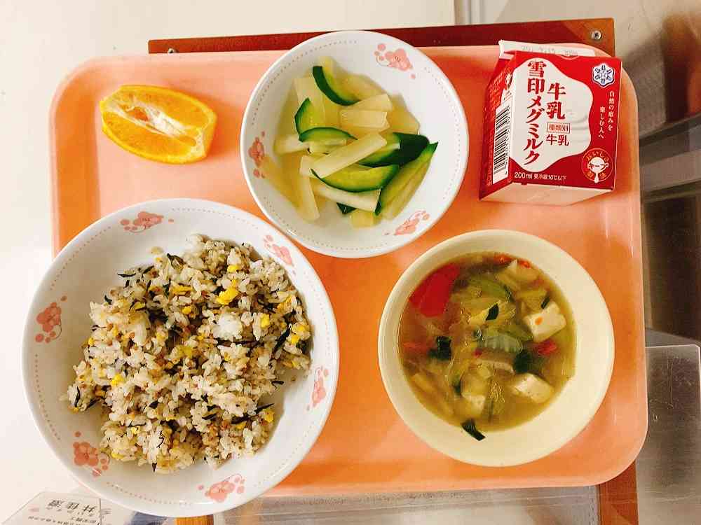 ひじき炒飯、大根の浅漬け、中華スープ、いよかん