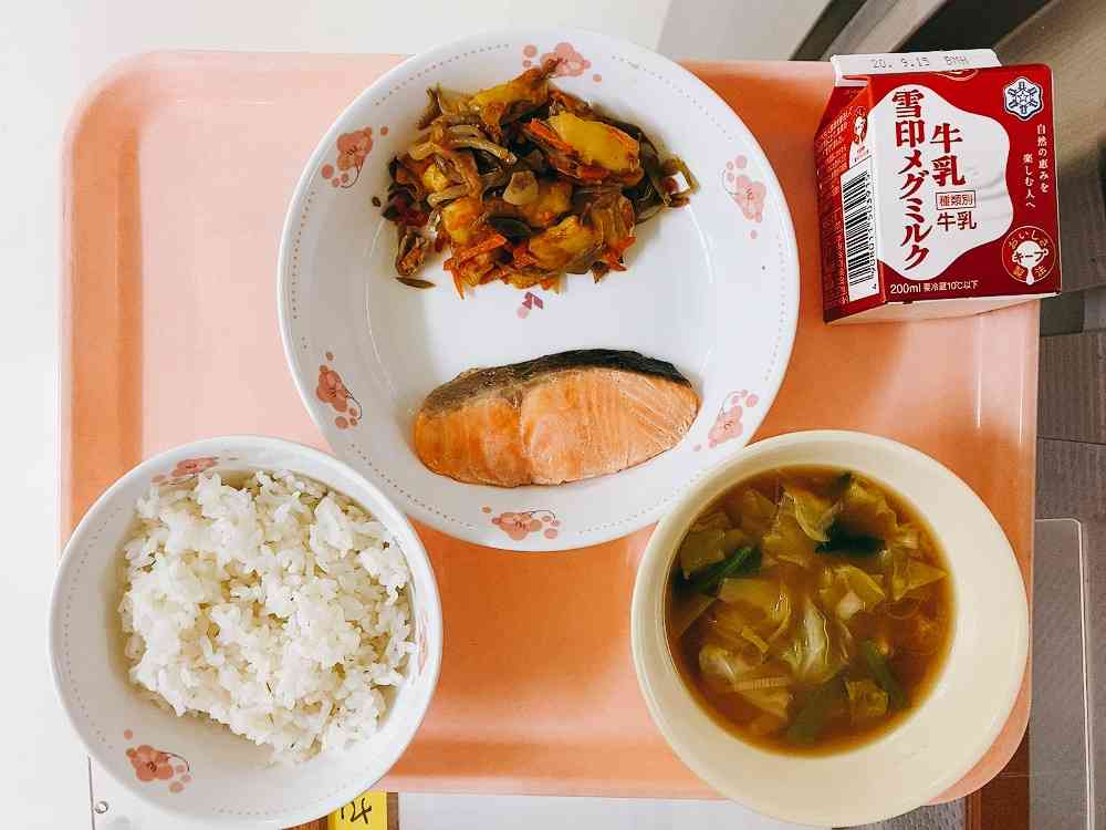 ごはん、鮭の塩焼き、じゃがいものきんぴら炒め、キャベツのみそ汁