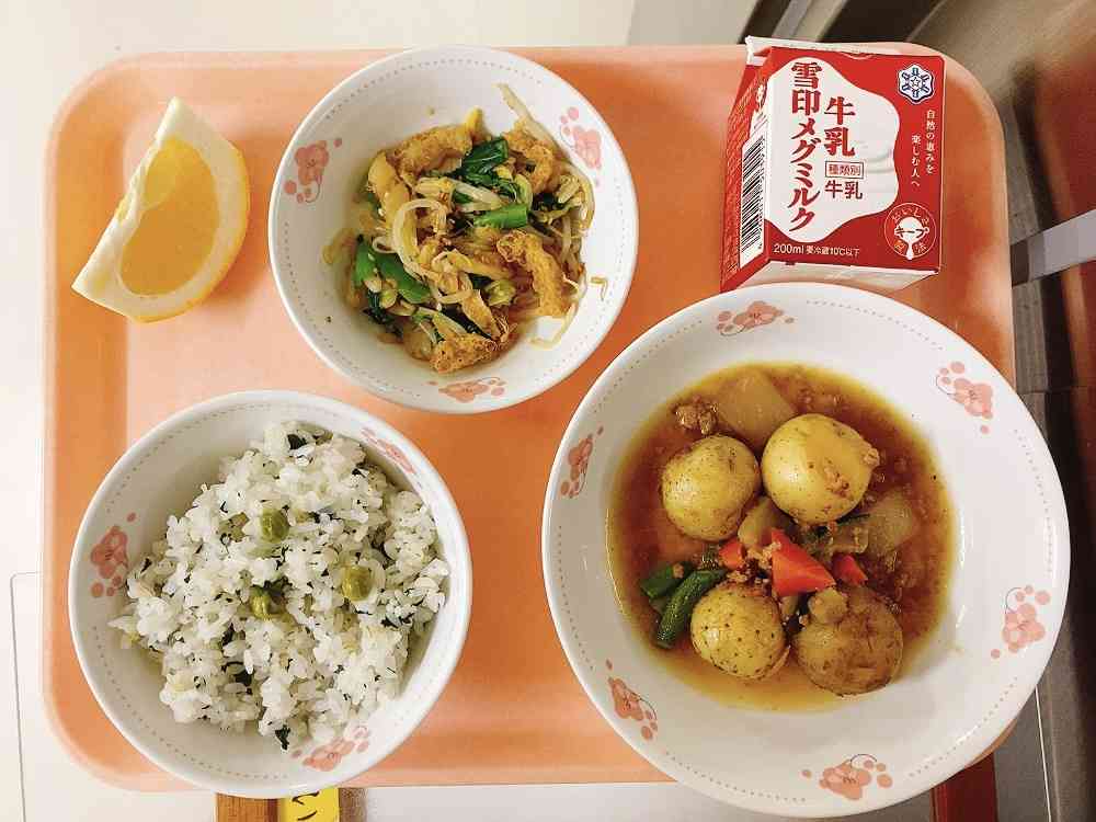 ピースごはん、新じゃがいものそぼろ煮、油揚げ入りおひたし、美生柑