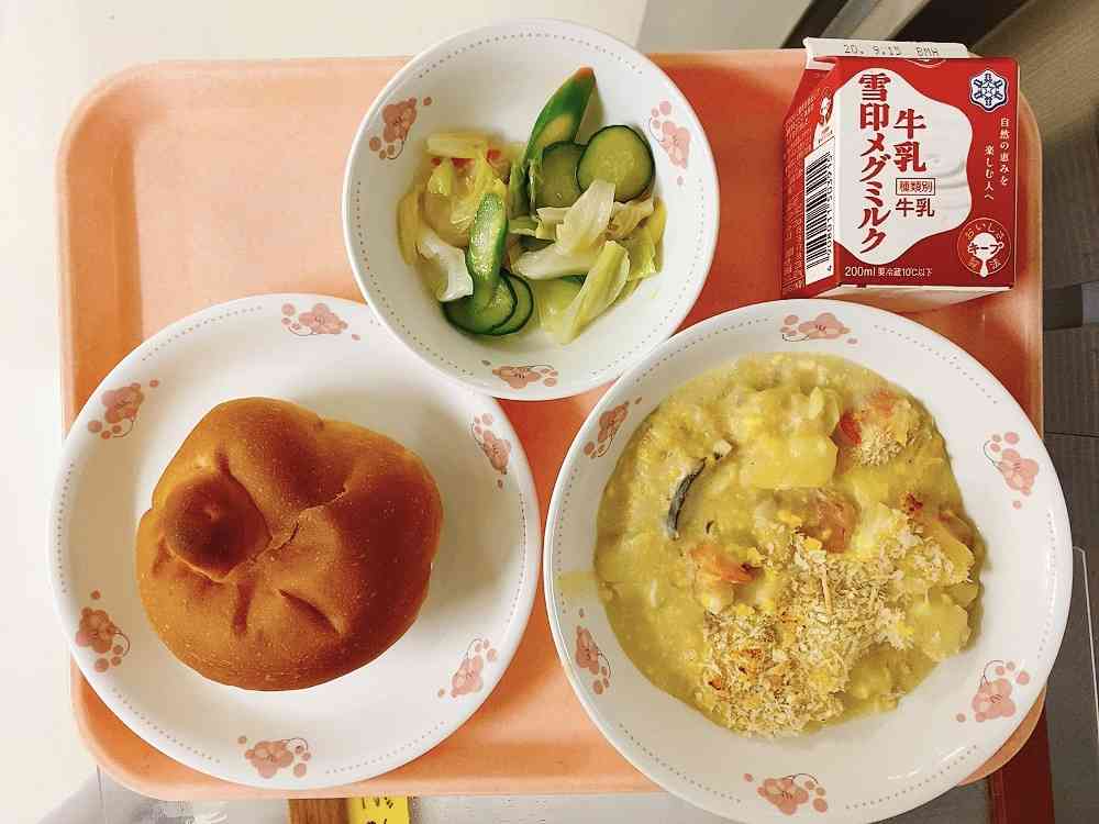 ミルクパン、ポテトエッググラタン、アスパラ入りサラダ