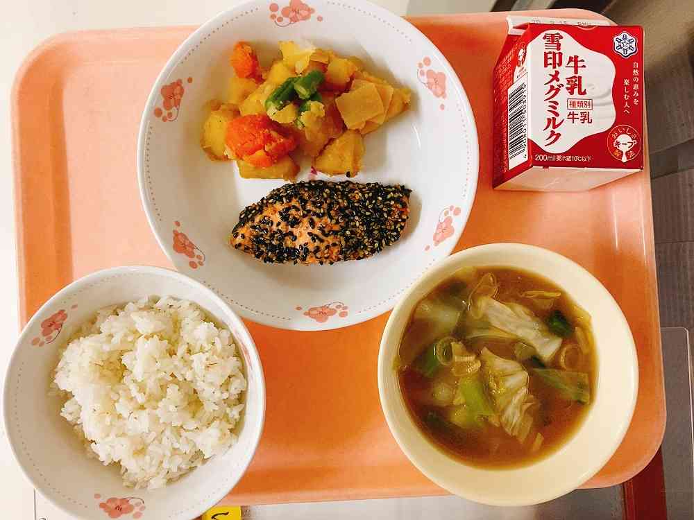 ごはん、鮭の南部焼き、じゃがいもの煮物、キャベツと油揚げのみそ汁