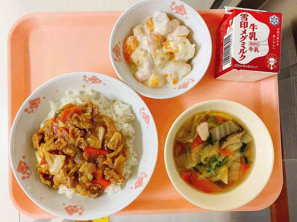 回鍋肉丼、中華スープ、フルーツヨーグルト