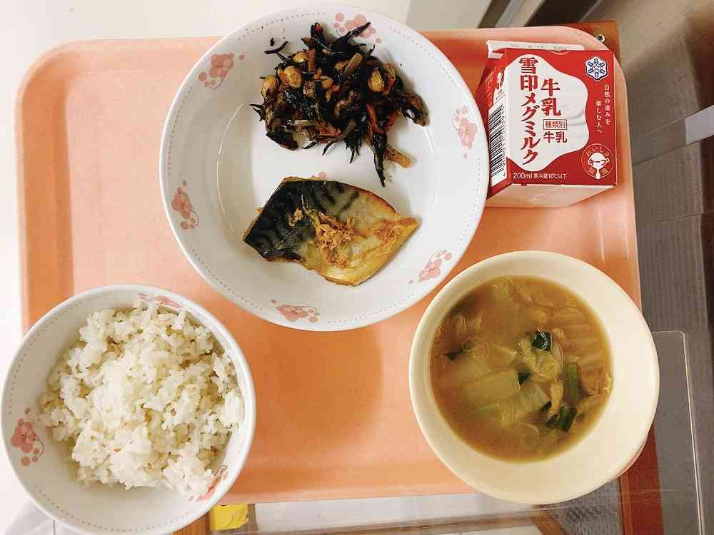 ごまごはん、さばのしょうが焼き、ひじきと大豆の炒め煮、白菜のみそ汁