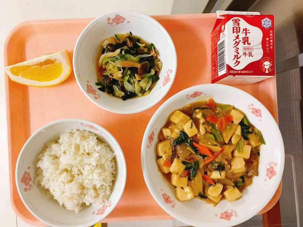 ごはん、豆腐と豚肉のみそ炒め、きのこのピリ辛あえ、美生柑