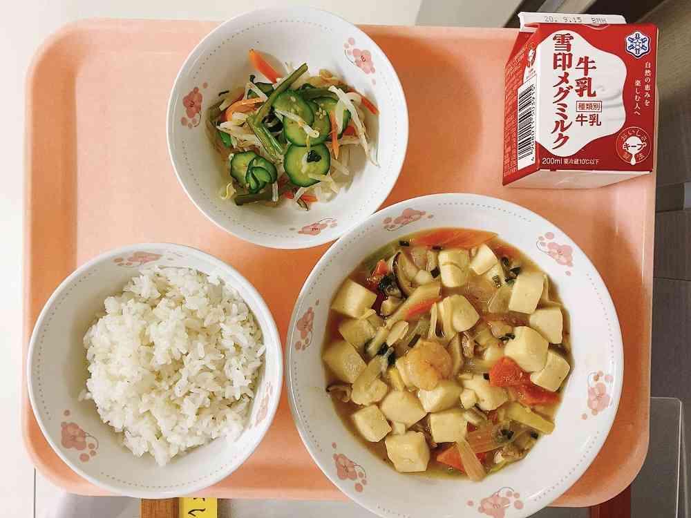 ごはん、豆腐と海老の旨煮、サラダ(中華ドレッシング)