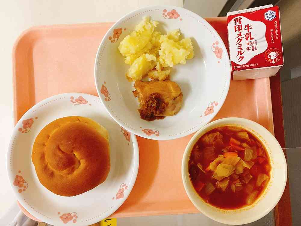 ミルクパン、鶏肉のバーベキューソース、粉ふきいも、ミネストローネスープ