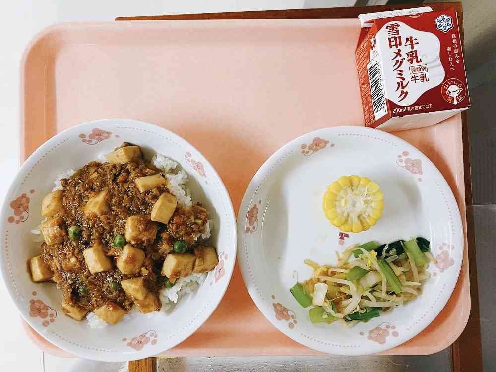 麻婆丼、おひたし(辛子醤油)、とうもろこし
