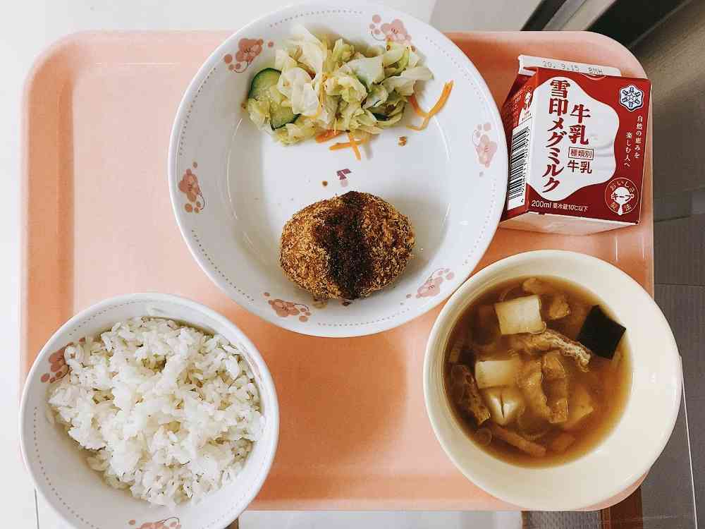 ごはん、かぼちゃのコロッケ、キャベツの香り漬け、豆腐とわかめのみそ汁
