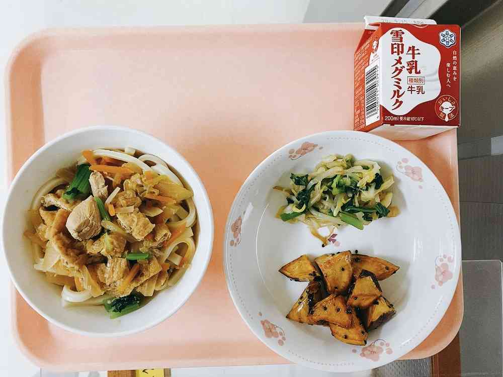 冷やしきつねうどん、おひたし(だし醤油)、大学いも