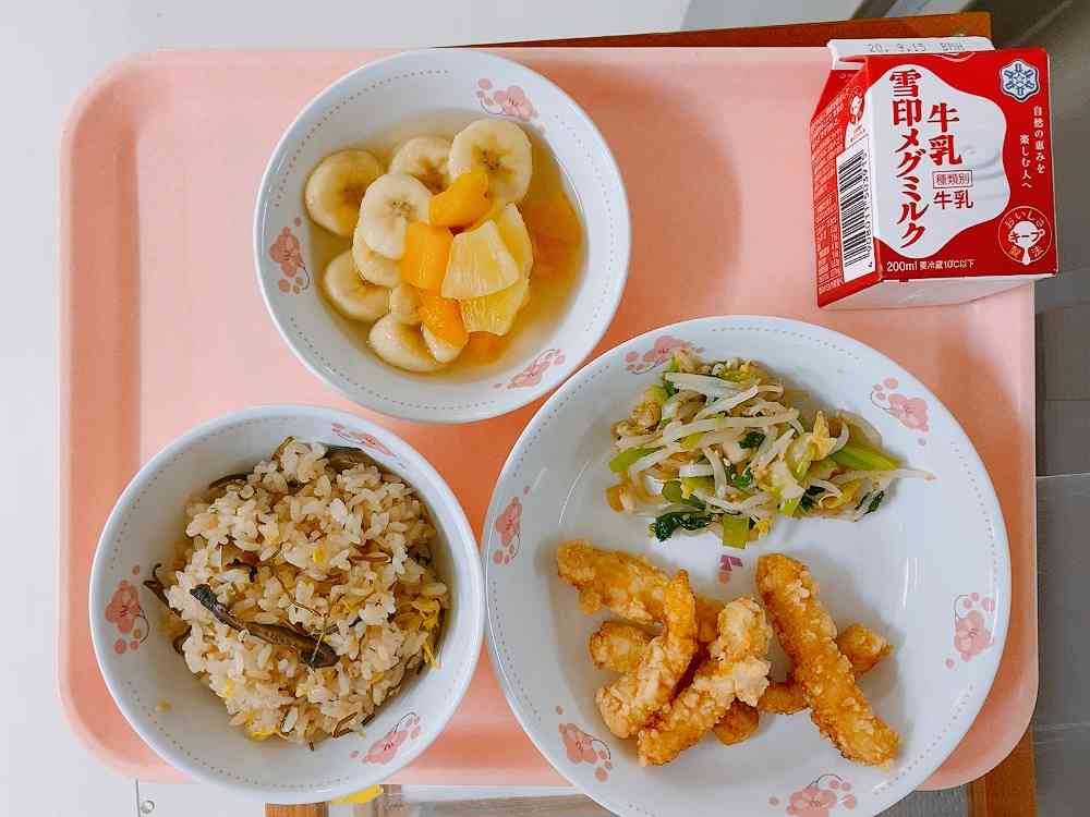 菊花ごはん、いかのたつた揚げ、おひたし(ごまかけ)、フルーツポンチ