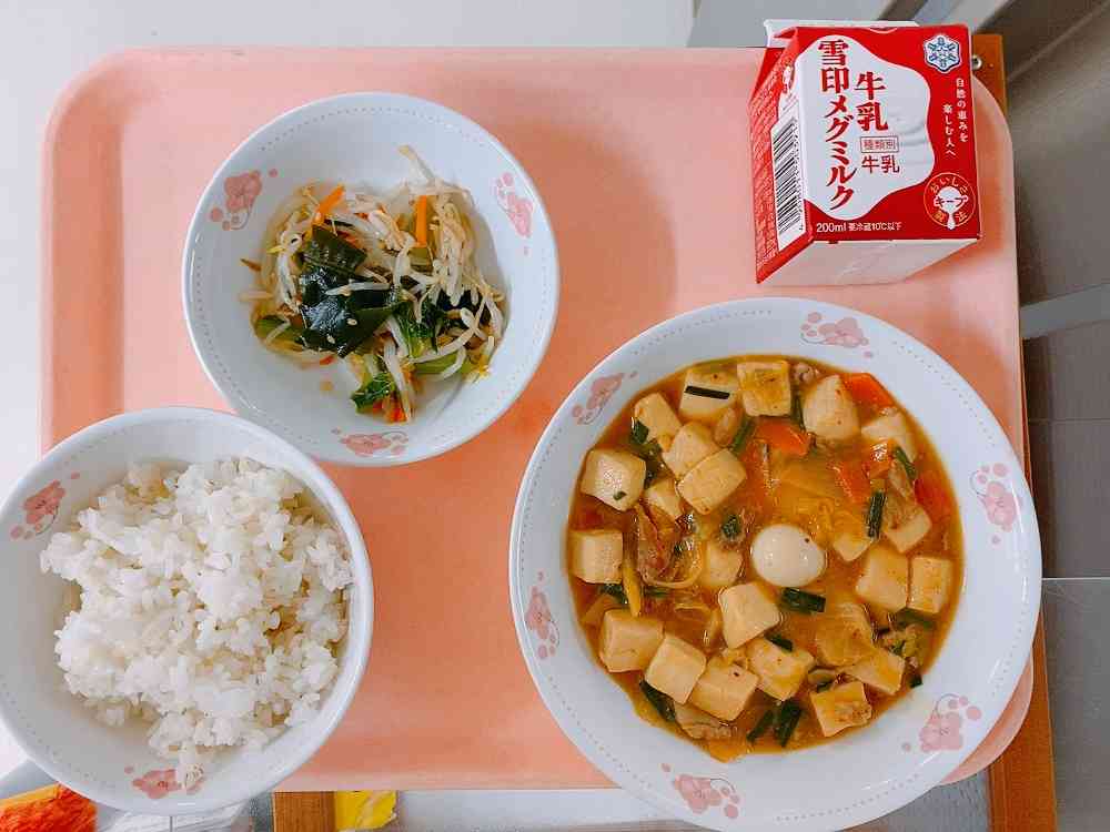ごはん、豚キムチ豆腐、もやしとわかめのごま醤油