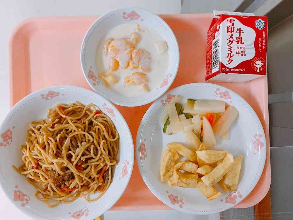 ソース焼きそば、華風甘酢、フライドポテト、フルーツヨーグルト