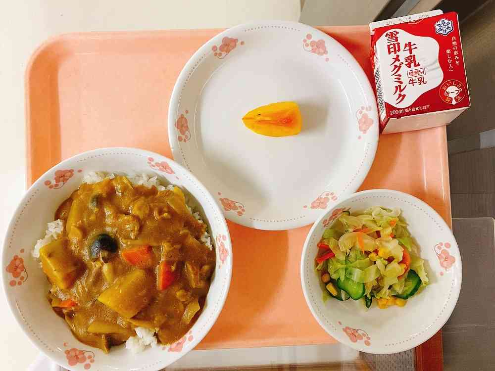 秋野菜のカレーライス、コーン入りサラダ、柿