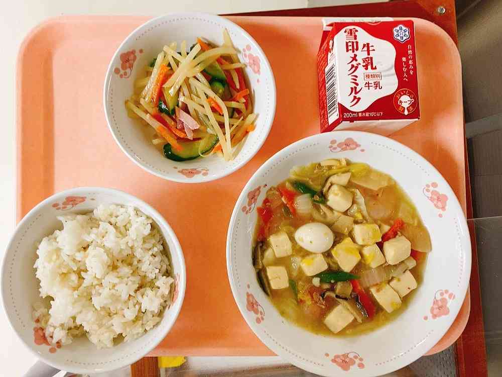 ごはん、豆腐とえびの中華炒め、千切りじゃがいものサラダ