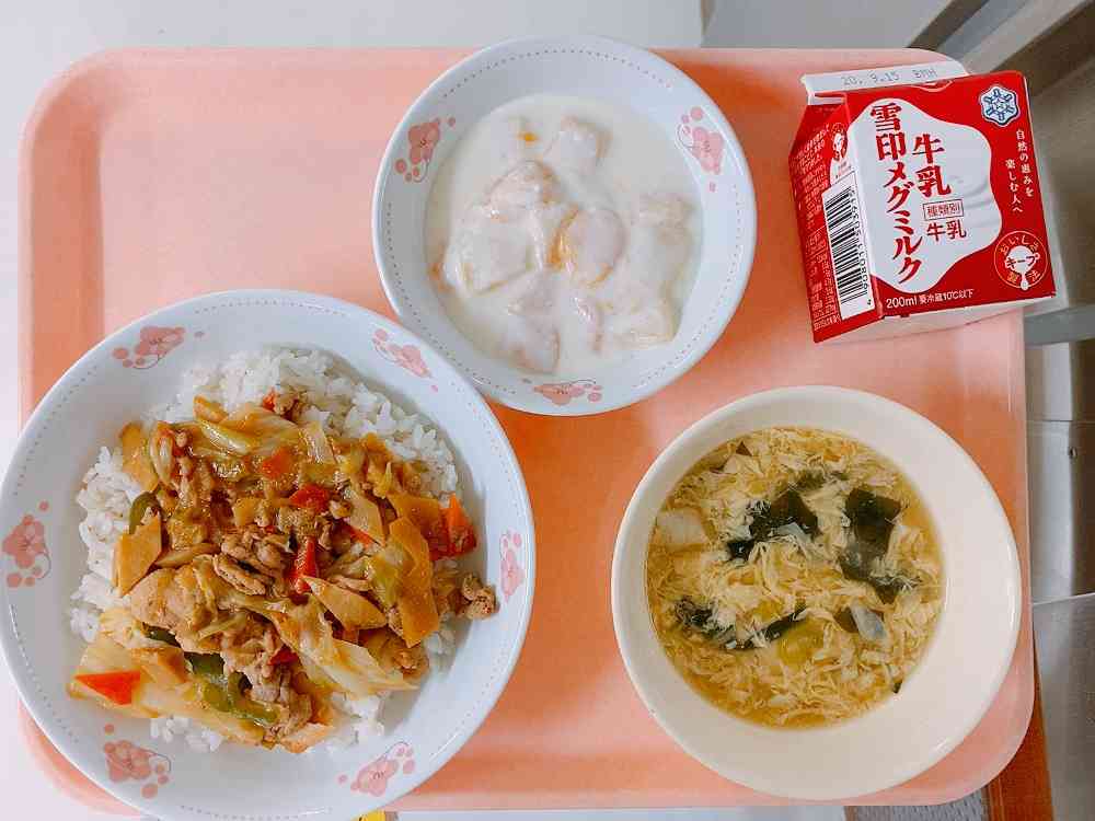 回鍋肉丼、わかめと卵のスープ、フルーツヨーグルト