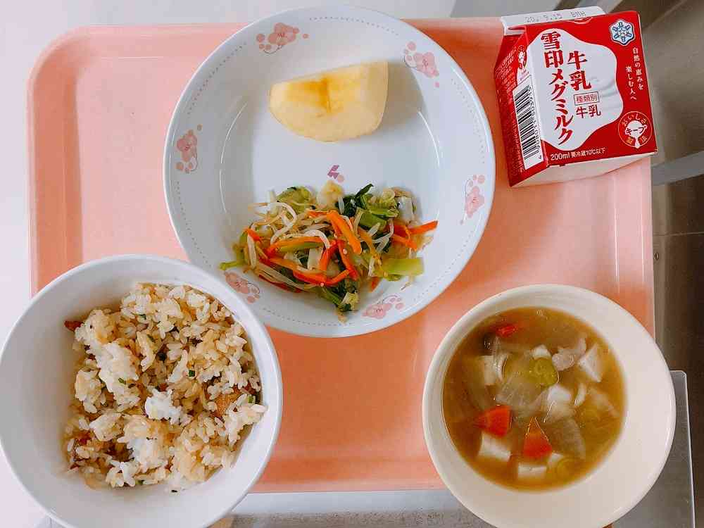 さんまごはん、小松菜の和え物、豚汁、りんご