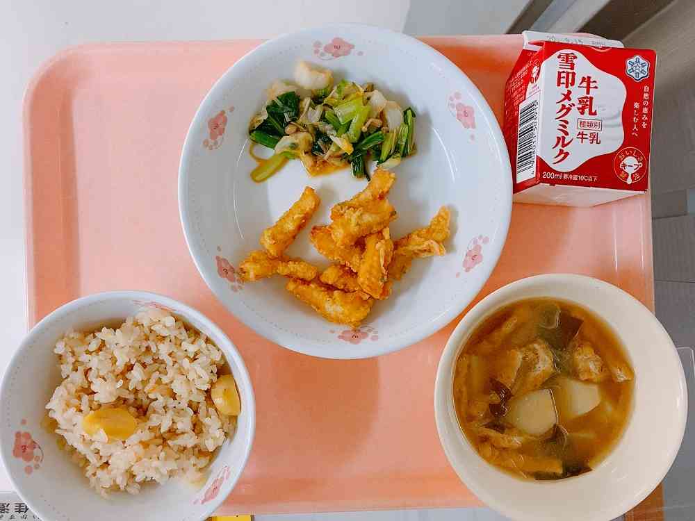 栗ごはん、いかの磯辺揚げ、なめたけ入りおひたし、じゃがいものみそ汁