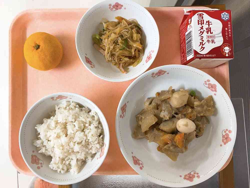 ごはん、鶏肉と里芋の炒め煮、はりはりサラダ、みかん