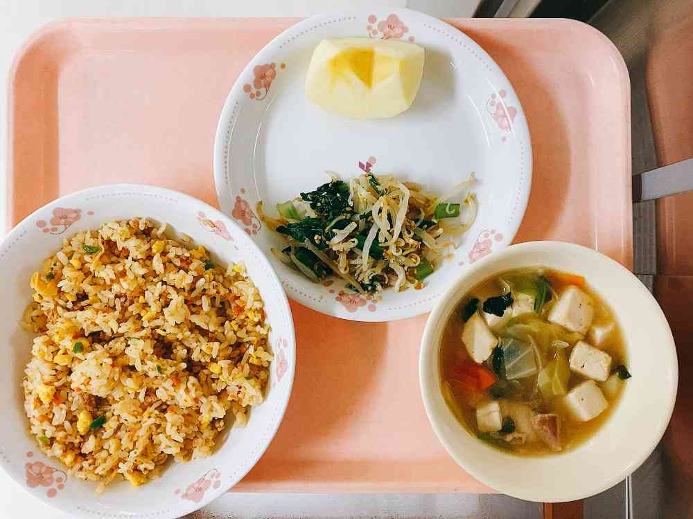 キムチ炒飯、青菜とじゃこのおひたし、豆腐のスープ、りんご