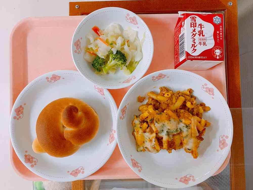 ミルクパン、ミートグラタン、ブロッコリー入りサラダ