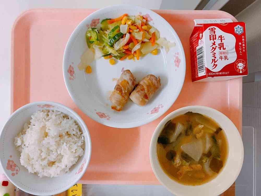 ごはん、そのときがくるくるなすの肉巻き、コーン入りサラダ、かぶのみそ汁