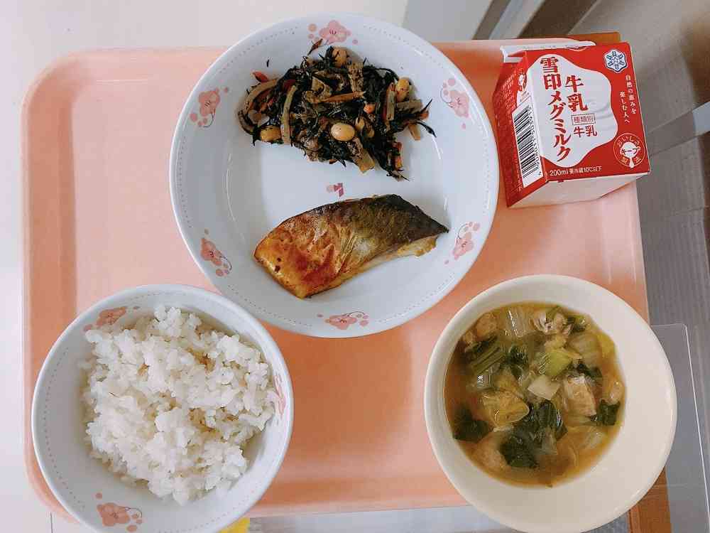 ごはん、さばの塩麹カレー焼き、ひじきと大豆の炒め煮、白菜のみそ汁