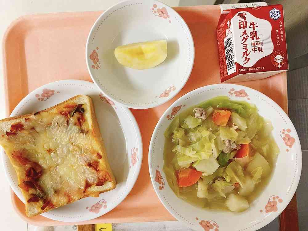 ピザトースト、スープ煮、りんご