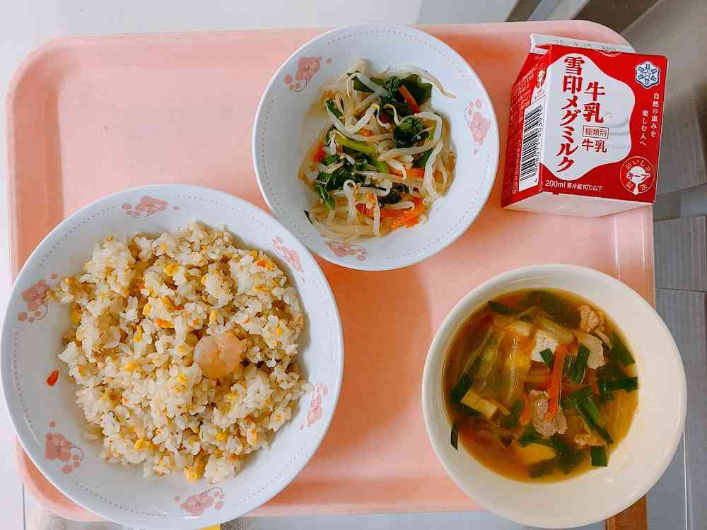 五目炒飯、もやしとわかめのごま醤油、キムチスープ