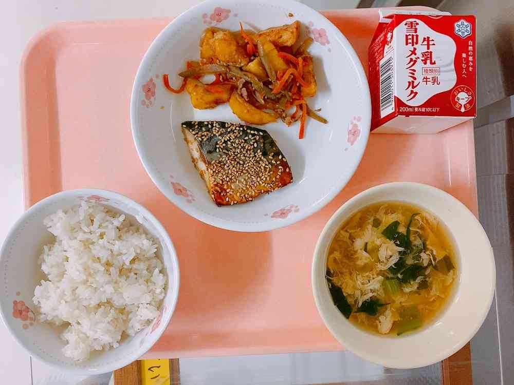 ごはん、さばのごま付け焼き、じゃがいものきんぴら炒め、かきたま汁