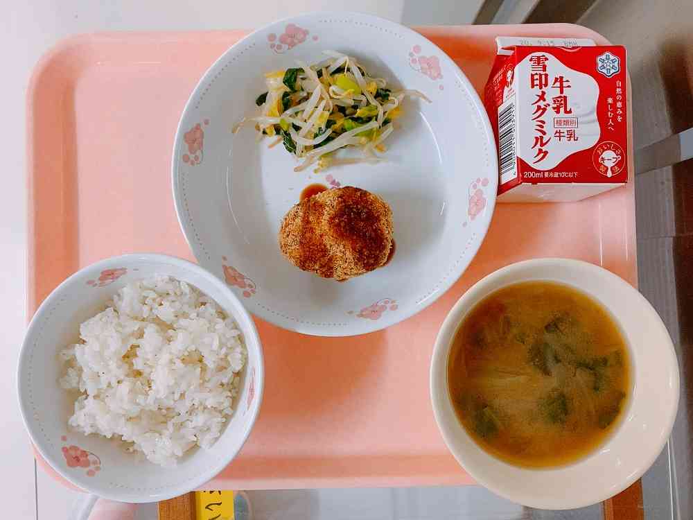 ごはん、ビーンズコロッケ、おひたし(辛子醤油)、大根のみそ汁