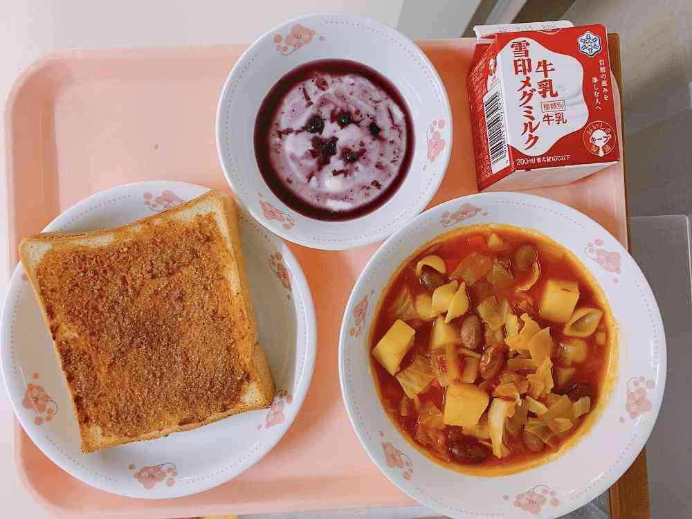 ごまきなこトースト、4-1のリクエストメニュー(ミネストローネ)、ヨーグルト(ブルーベリーソース)