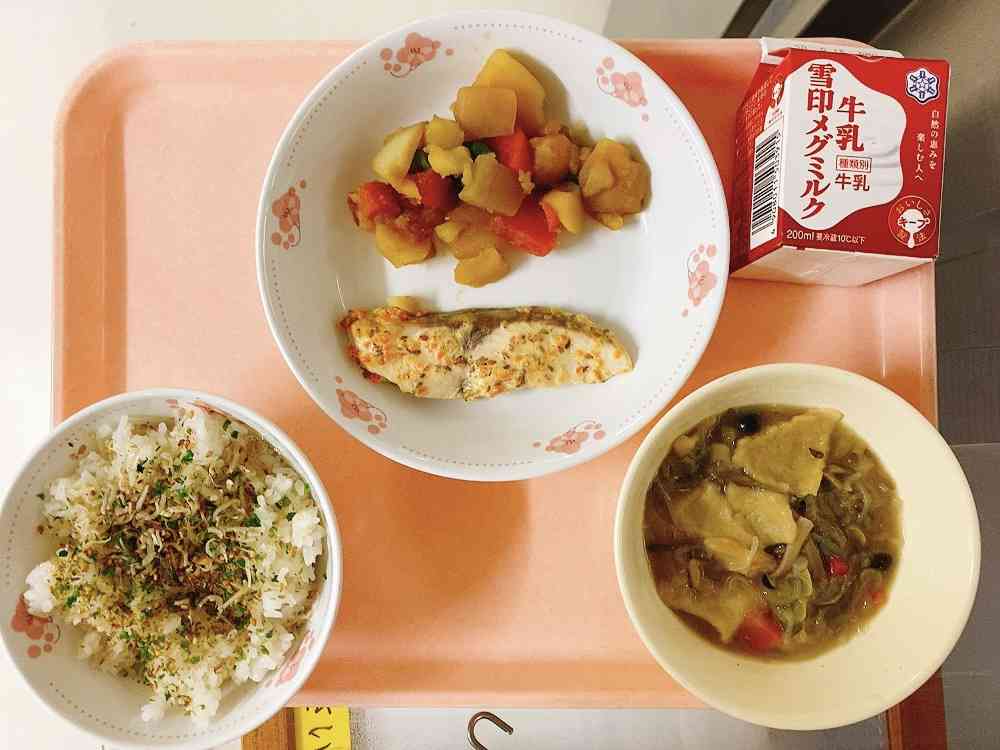 ごはん、じゃこふりかけ、しいらのみそマヨネーズ焼き、野菜の煮物、せんべい汁