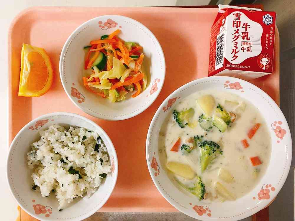 わかめごはん、米粉のクリームシチュー、にんじんとツナのサラダ、いよかん 予定献立から、きなこ揚げパンがわかめごはんに変更になりました。