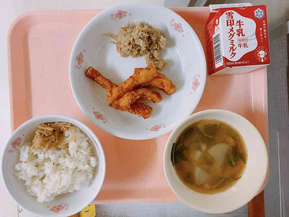 ごはん、なめ茸、いかのたつた揚げ、おからの煮物、かぶのみそ汁