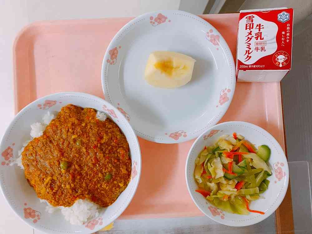 ドライカレーライス、海藻入りサラダ、りんご