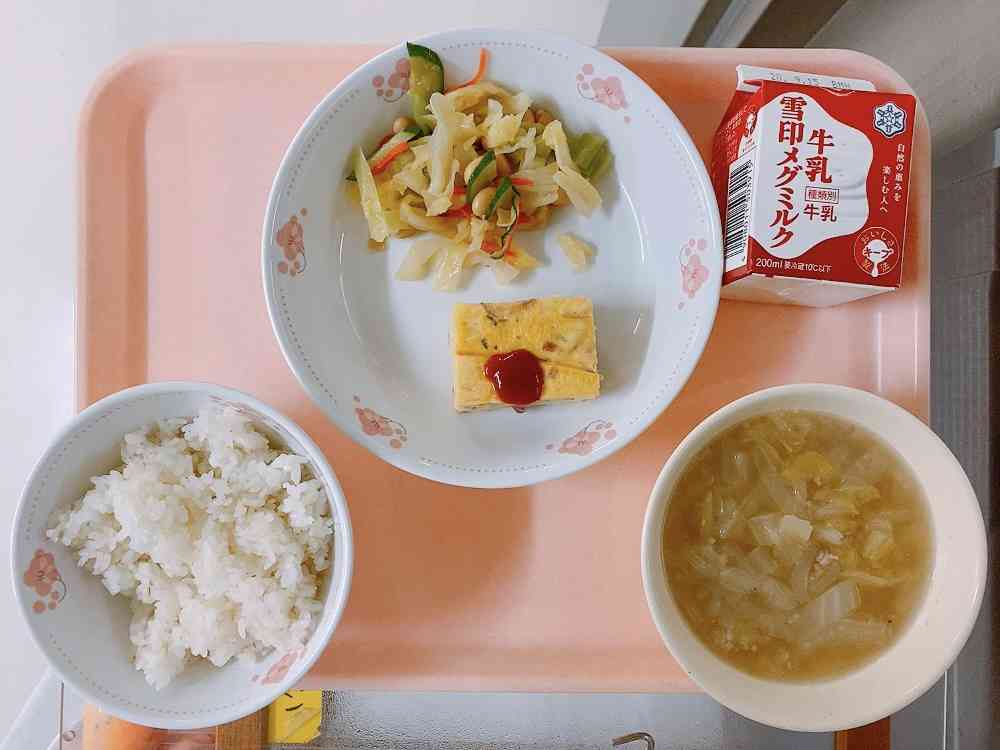 ごはん、ポテトオムレツ、大豆入りサラダ、白菜とひき肉のスープ