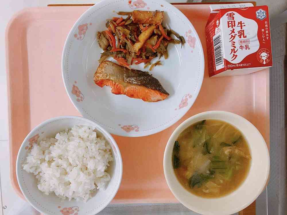 ごはん、鮭の照り焼き、じゃがいものきんぴら炒め、キャベツのみそ汁